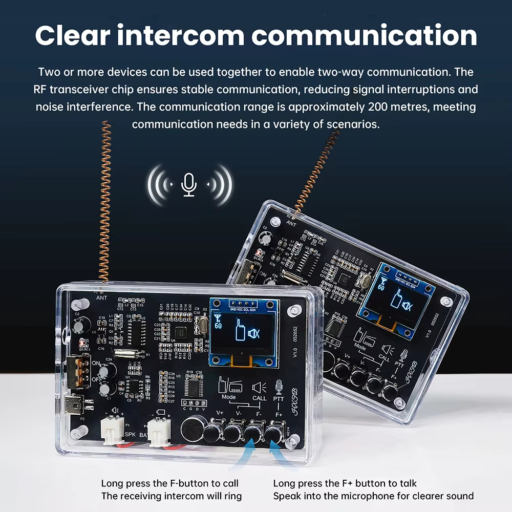 Equipped with exceptional features, this kit boasts a 0.96-inch OLED display that offers a clear and crisp display of the radio’s functions. The walkie talkie operates within the 87-108MHz frequency band and has a communication range of approximately 200 meters, making it ideal for various communication scenarios. Additionally, the kit’s intelligent intercom function combines radio reception with intercom capabilities, allowing users to communicate with ease.