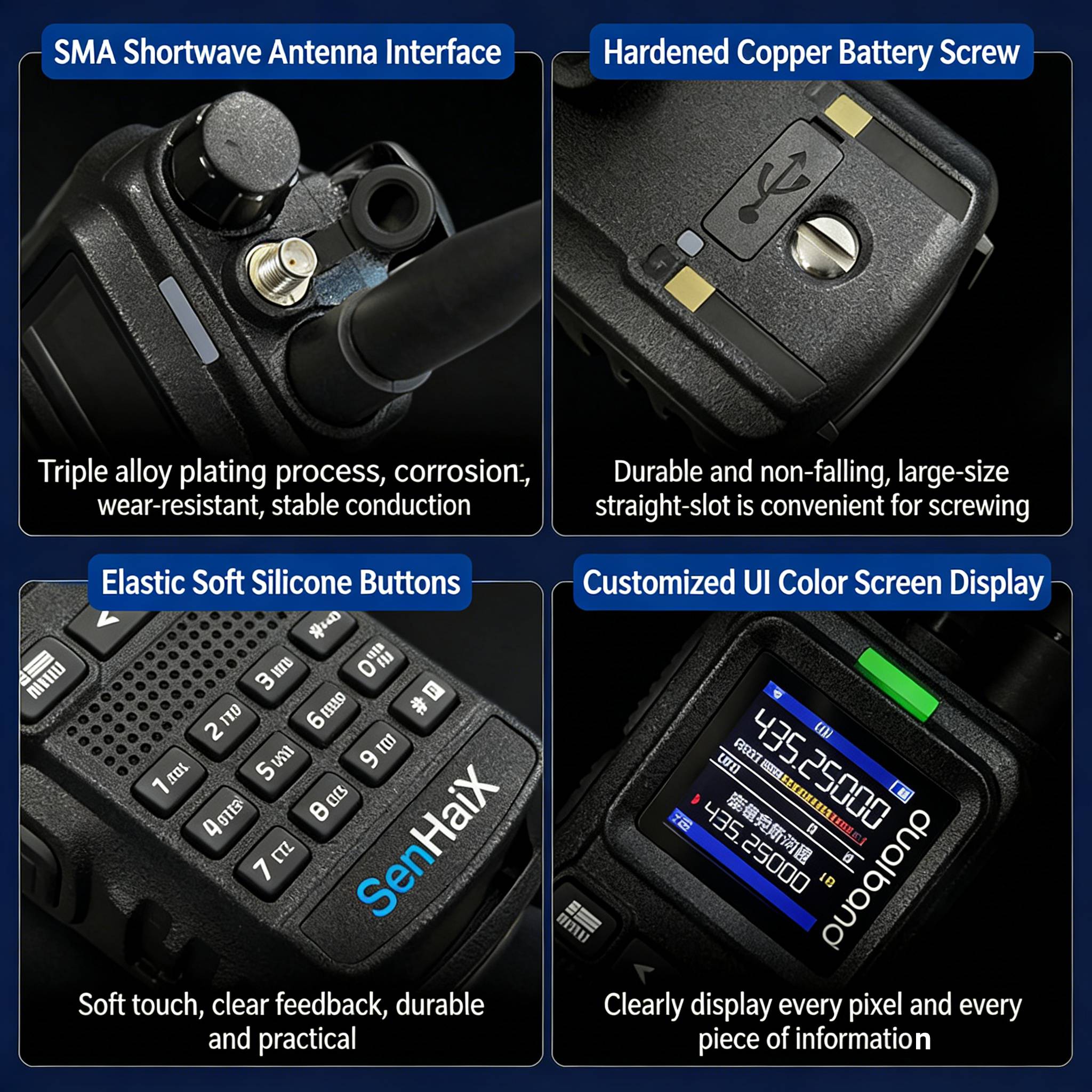 Stay connected when it matters. The original SENHAIX SHX-8650 delivers up to 8 W output on VHF & UHF, features built-in Bluetooth programming, dual independent PTT, flashlight with SOS strobe and IPX4 weather protection—ideal for outdoor, security and emergency use.