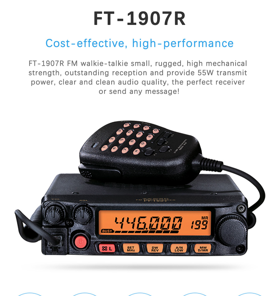 The FT-1907R is a ruggedly-built, high-performance 55-Watt UHF mobile FM transceiver with outstanding receiver performance and crisp, clean audio. Optimized for ease of operation day or night, the FT-1907R is one tough radio for operating in a tough world!